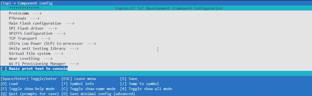 In a few seconds, your text-based interface should open. You navigate with the arrow keys, press Enter to select, Space to toggle booleans, Esc (or q) to go back, and / to search. Either search for your symbol (SAY_HELLO) or navigate to Component config and find the description of your custom symbol (likely at the bottom with “Basic print test to console”).