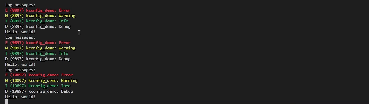 In this code, we simply log some messages out over the serial port. We can define the log level in Kconfig. You’ll also notice that we have the conditional preprocessor #ifdef here: