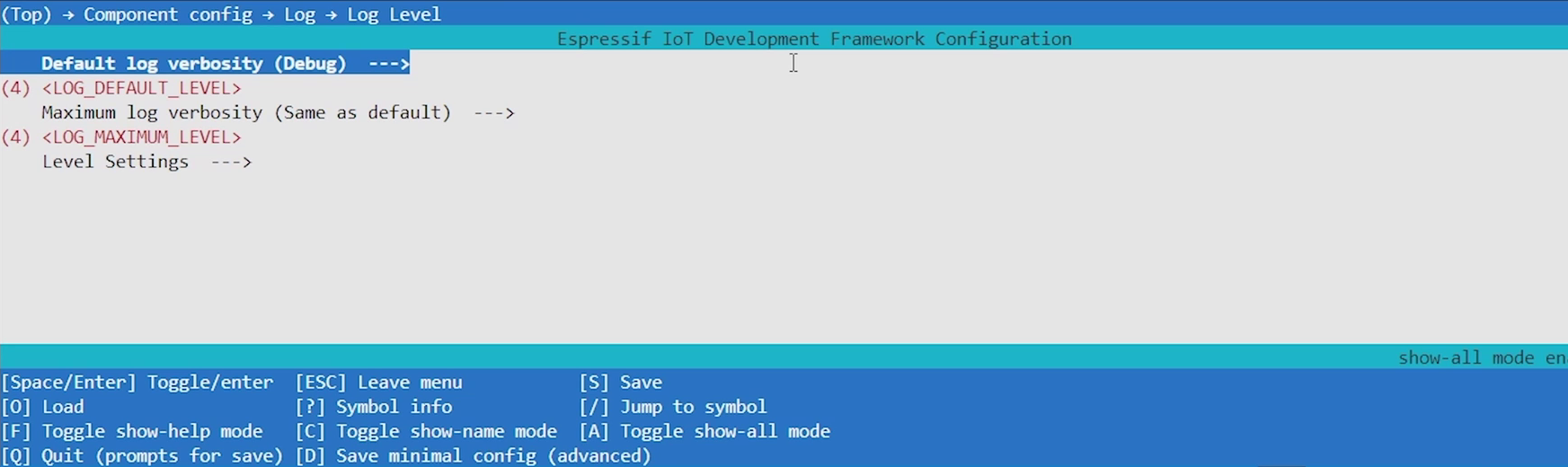 Feel free to try changing the log verbosity in menuconfig. Navigate into Component config > Log > Log Level. Highlight Default log verbosity, press enter to go into the selection, highlight a new verbosity level (e.g. Debug), and press space to select it.